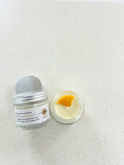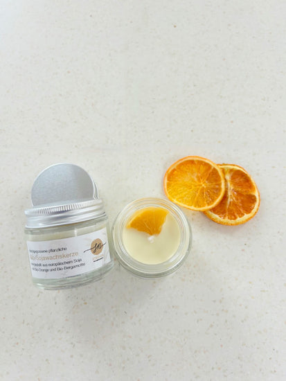 Entdecke unsere Bio-Sojakerze – handgegossen aus französischem Sojawachs und veredelt mit hochwertigen Bio-ätherischen Ölen von Bergamotte und Orange.